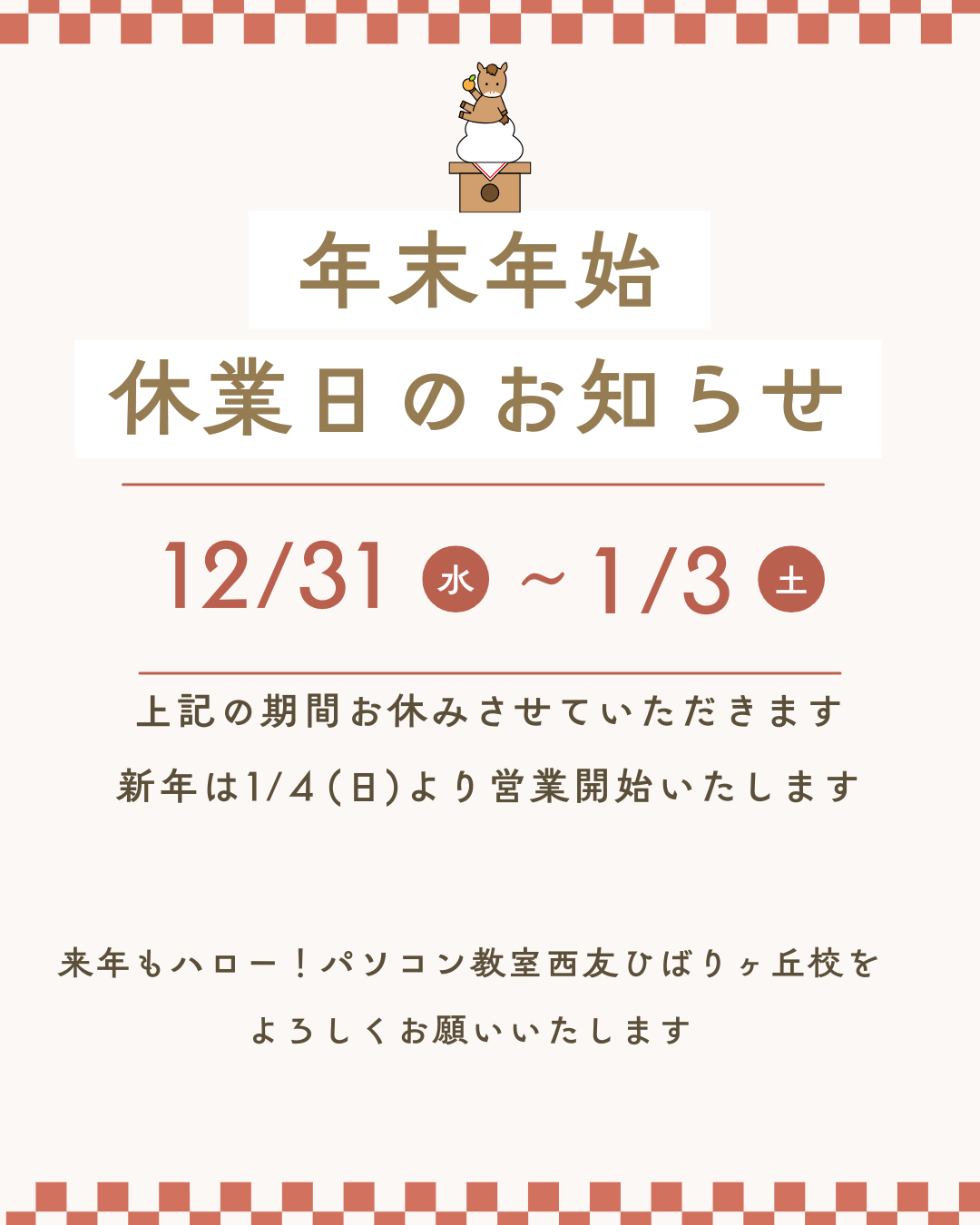 年末年始の教室スケジュールについてお知らせいたします。